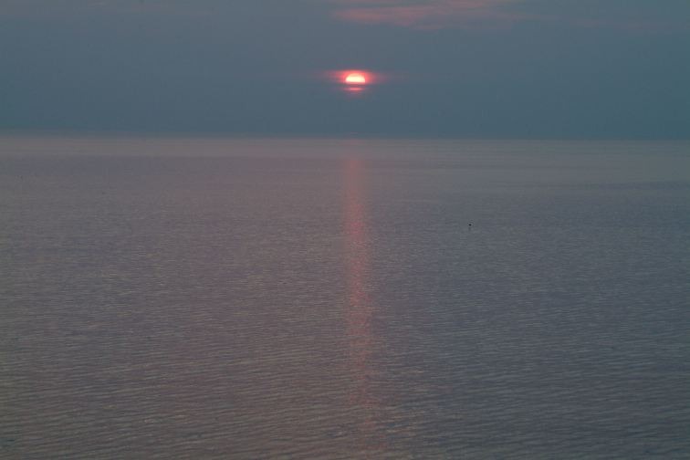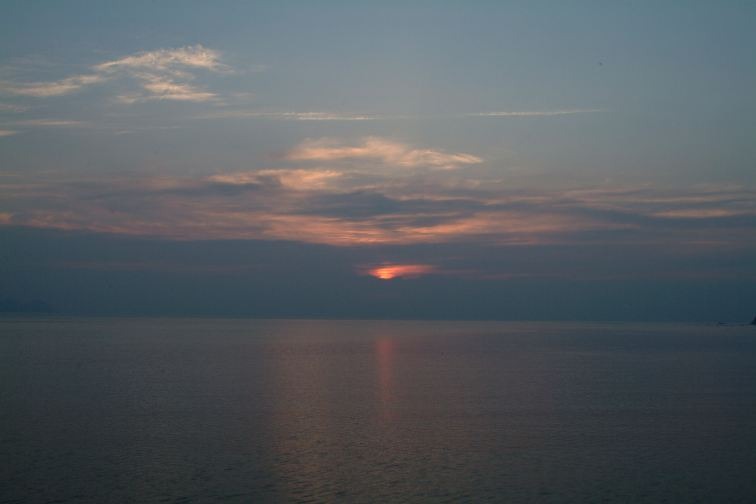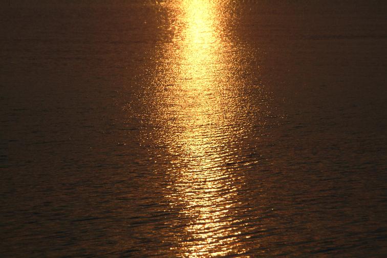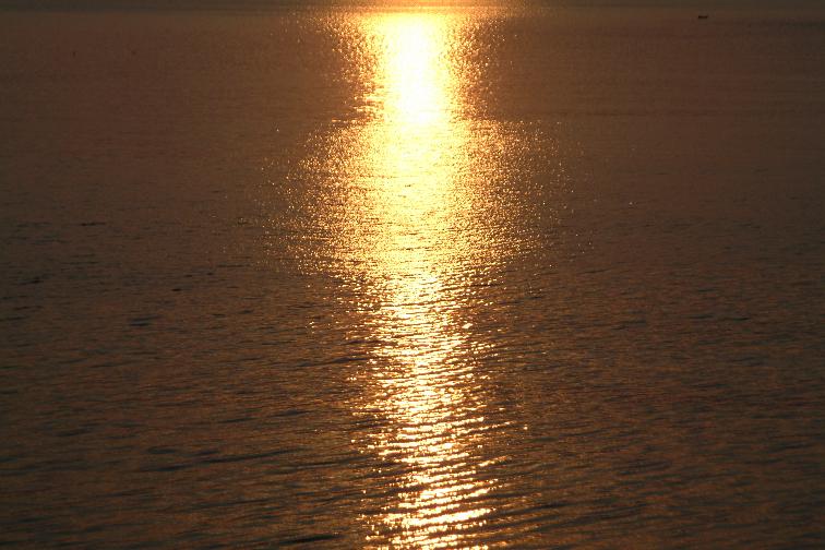 ●●● 若狭湾に夕日が沈みます。国道27号を走りながら、美浜町の海岸で出会った海に沈む太陽です。水平線の雲の間から何回もの演出を繰り返し、水面に映る金色の帯が赤味を増して、それから暗くなっていきます。(2003.6.4.) |