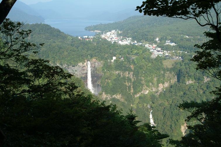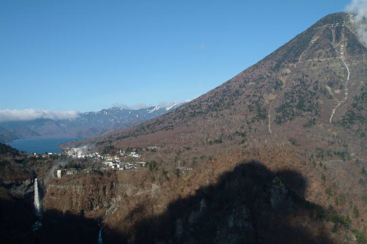 明智平から、後の雲で華厳の滝の日陰がなかなか消えなかった
